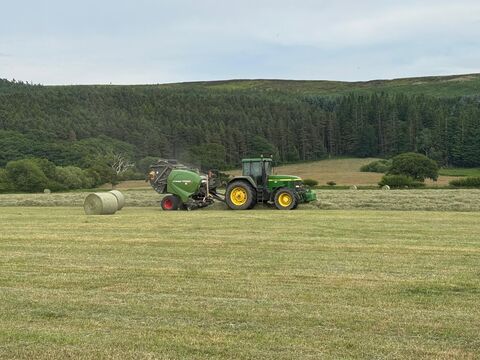 A green tractor pulls a round baler across a grassy field, producing cylindrical hay bales. One bale lies near the baler, with more scattered in the distance. Forested hills surround the rural scene.