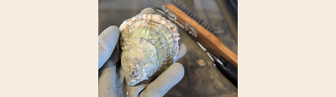 A gloved hand holds an oyster with green, white, and brown tones; a wire brush lies nearby on a workbench.
