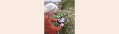 person looking through tablet device taking photo of a plant with coastal path in background