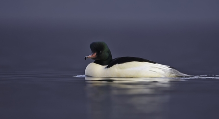 Goosander (Mergus merganser), swimming on still upland lake, Gwynedd, January 2009 - Richard Steel/2020VISION