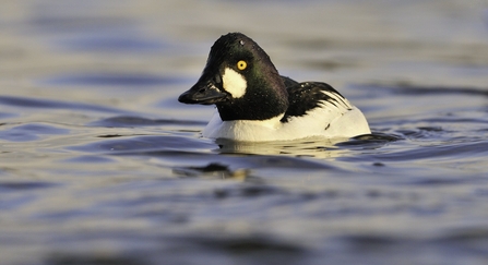 Goldeneyes breed in the Scottish highlands, but in winter can be found on lakes, large rivers and coasts around the UK. Males are dazzling with a black and white body and a large, rounded head. The head is glossy and can appear green or purple depending on the light, with a golden eye and a white patch behind the bill.