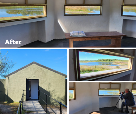 The hide, which had fallen into disrepair over years of use, was closed for two weeks during which it was completely refurbished by a team from the construction group. Work included: rendering, a replacement floor, removal of concrete seating and installation of new custom-made furniture, refreshed painting, new windows and frames, plus a freshly painted door and handrail.