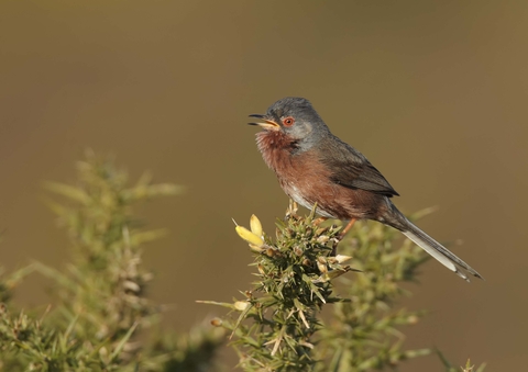 The small, brown Dartford warbler is most easily spotted when warbling its scratchy song from the top of a gorse stem. It lives on lowland heathland in the south of England, where it nests on the ground.