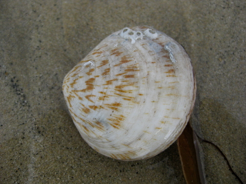 The dog cockle lives just below the surface of gravelly and sandy seabeds, out beyond the low tide mark and out to depths of 100m. It has a thick, round, clam-like shell covered with brick-red concentric markings on a pale background. They are spectacularly long-lived, reaching the grand old age of 100! We know this by counting the growth lines in their shell - much like you can count the growth rings of a tree!