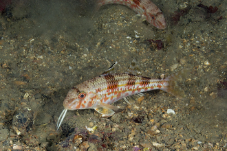 A Montagu's blenny lurking by an underwater patch of barnacles