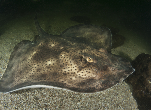 The blonde ray is a large skate that lives close to the sea floor. It likes sandy areas where its ochre-coloured body is camouflaged against the seabed, hiding it from any predators.