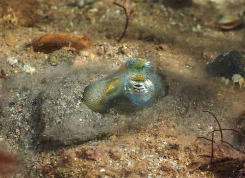 The little cuttlefish is a small, cup-shaped cephalopod with large eye bulges. They are in fact a type of bobtail squid, rather than a true cuttlefish, and don't have a cuttlebone. They spend much of their time buried in sandy seabeds with only their eyes exposed, on the look out for predators and their favourite prey - little crustaceans. Like common cuttlefish, they are able to change colour using the chromatophores in their skin. They most often appear a paleish white with brown and black splodges - enabling them to blend in with their sandy home.