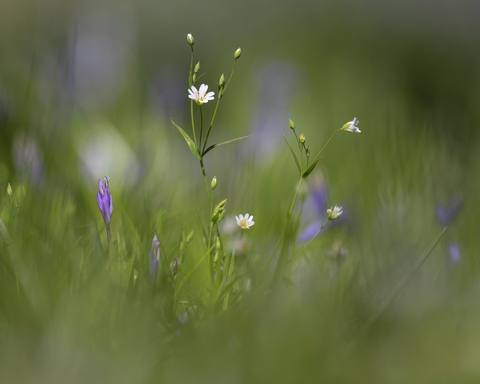 Greater stitchwort grows in woodland and along roadside verges, hedgerows and grassy banks. It has many other common names, including 'wedding cakes', 'Star-of-Bethlehem', 'daddy's-shirt-buttons' and 'snapdragon' - the latter because its stems are brittle and easily break. Its pretty, star-shaped, white flowers bloom from April to June; as the seed capsules ripen, they can be heard 'popping' in late spring.